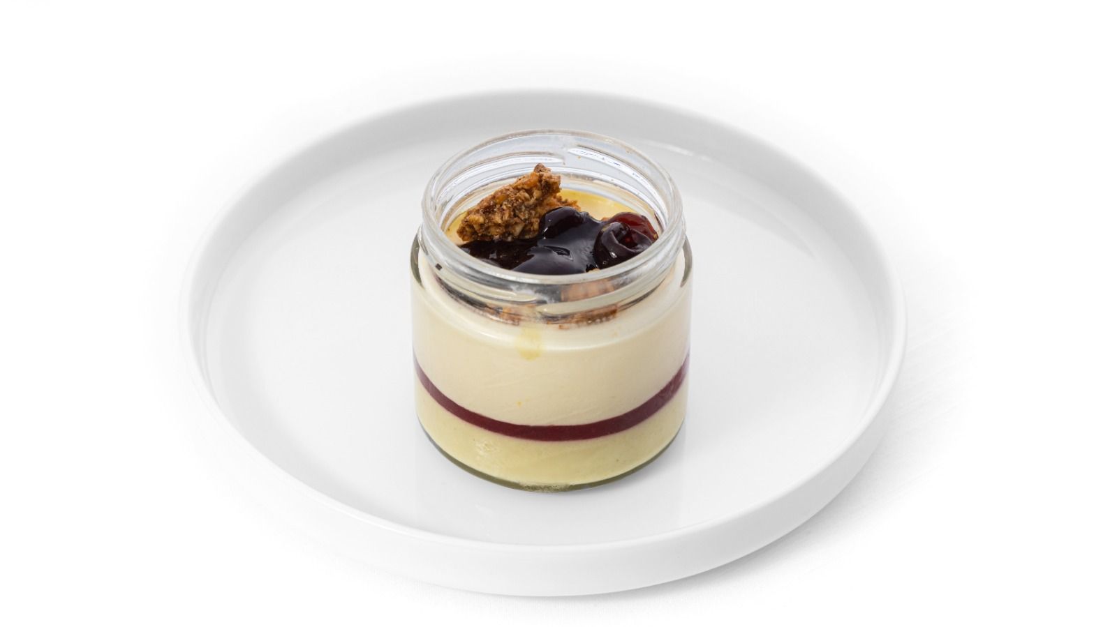 zuccherino in vetro con frutti di bosco con morbida crema di ricotta con nota di vaniglia,