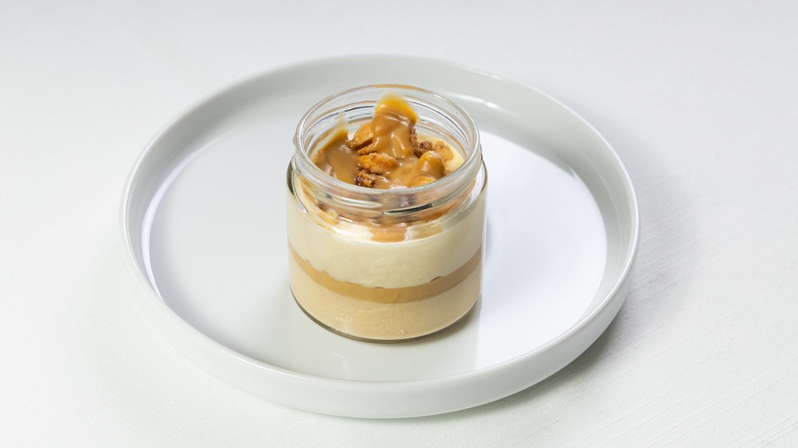 zuccherino in vetro con cuore di caramello, variegato alle arachidi e un abbraccio di mousse al cioccolato bianco