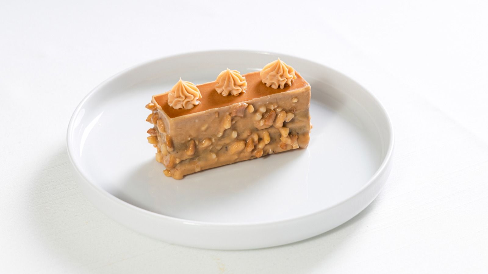 Croccante alle arachidi, bisquit al cacao, cremoso al caramello salato, mousse di cioccolato al latte, ricoperto da un pralinato alle arachidi