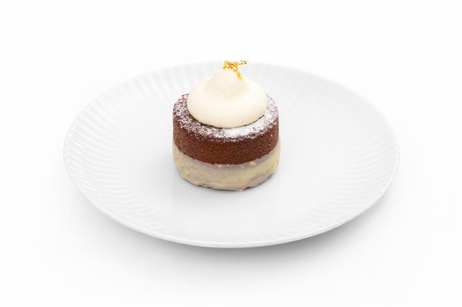Ricetta classica della caprese con mandorle d'avola rivisitata in chiave moderna con cremoso croccante wafer e cioccolato bianco, il tutto esaltato da una chantilly alla vaniglia con vezzo in foglia oro